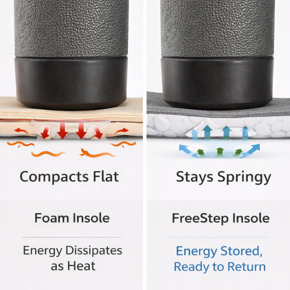 Unlike foam insoles that absorb your energy, FreeStep Insoles use a carbon-composite core that acts like a spring, returning 90% of your impact energy with each step.